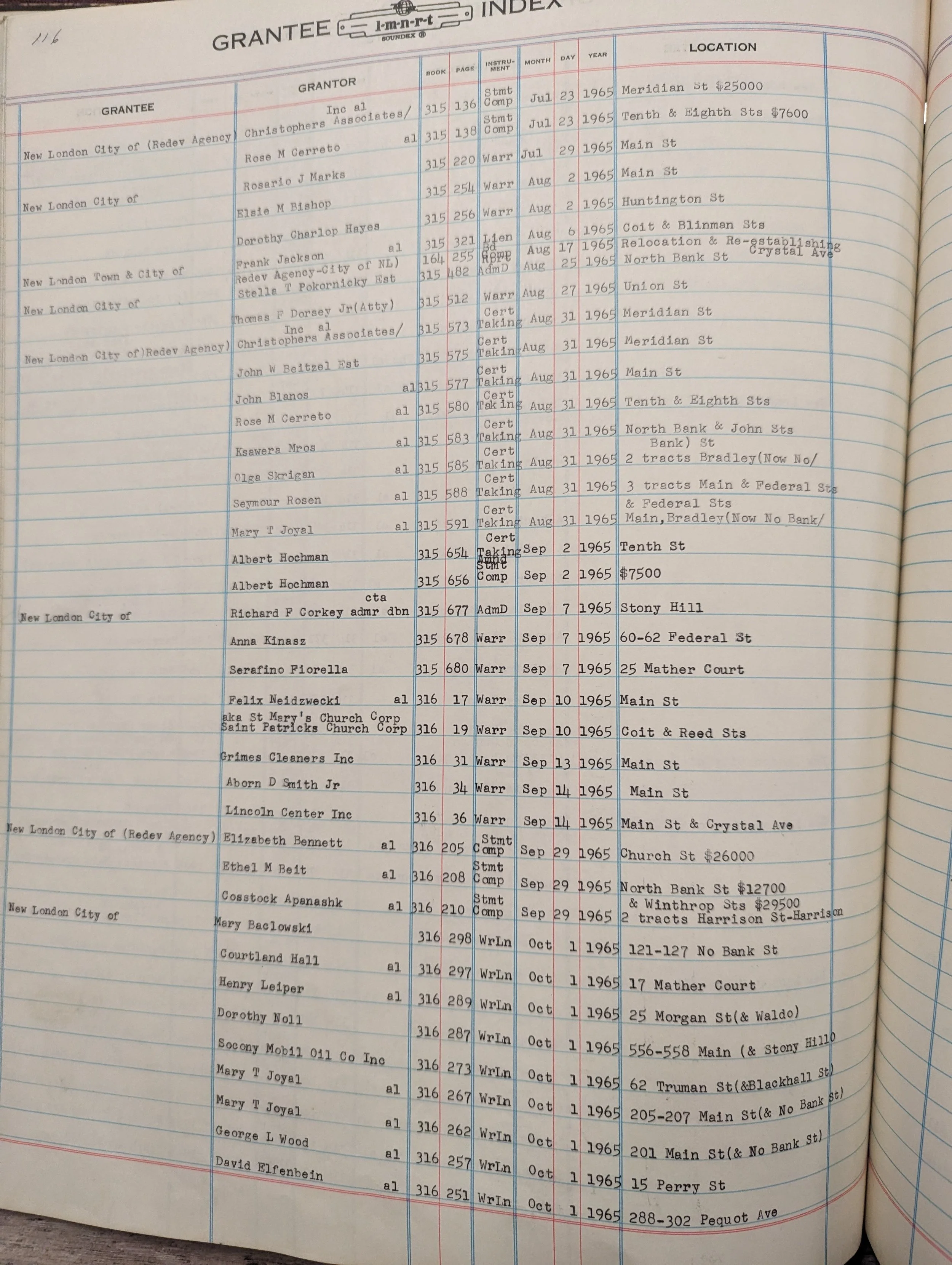 Property owners can use the option of rejecting the agency‘s initial offer through a neutral board of review in Hartford. As an example, the Soltz family filed an appeal in 1966 over the sum offered by redevelopment for their three properties on John Street. To the Grantor’s (Soltz family) satisfaction, the appeal board awarded a higher offer with which redevelopment had to comply and the property deeds were conveyed to the City of New London acting on behalf of redevelopment. There was no forced seizure of the property through eminent domain, no certifed taking.