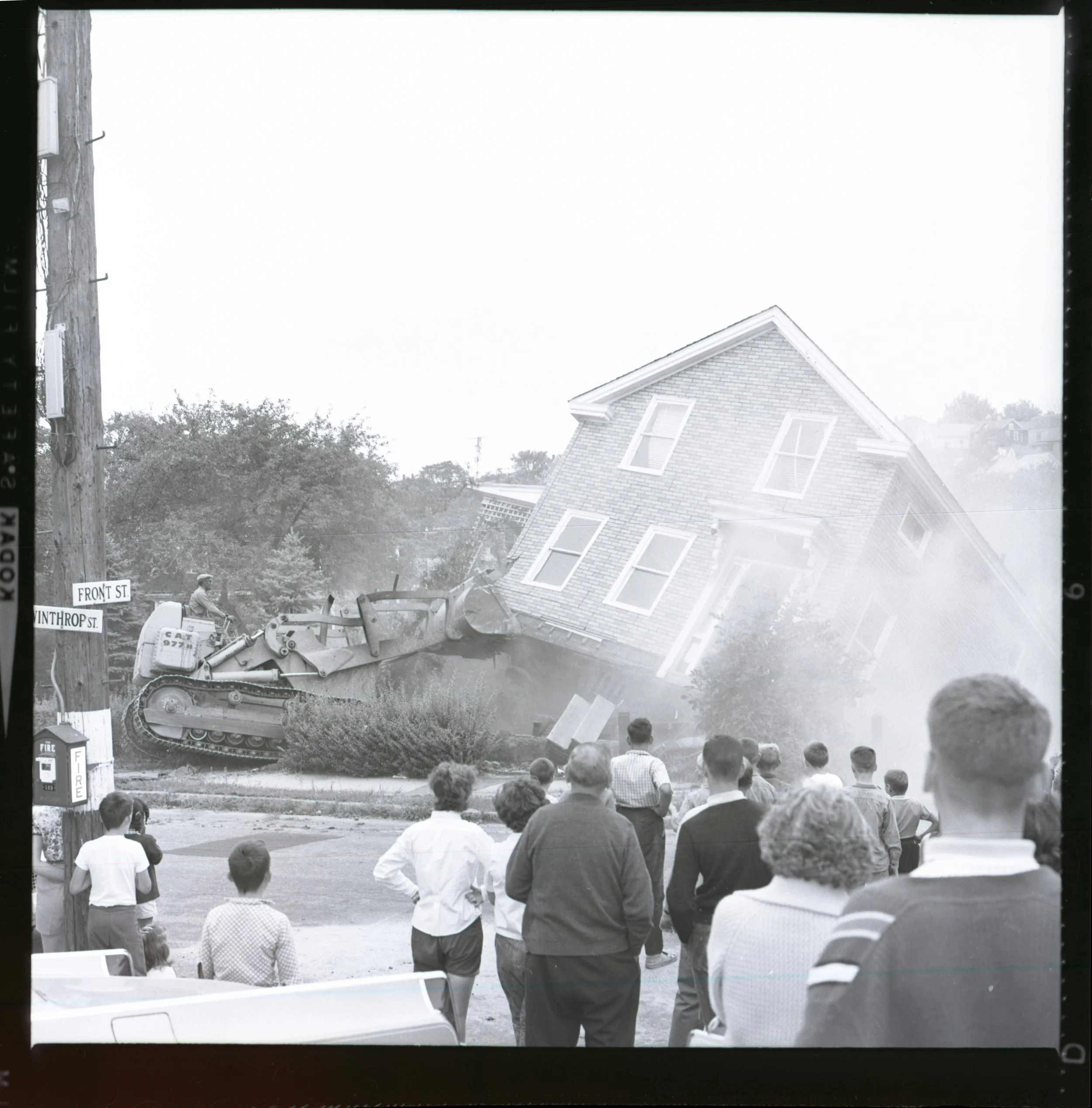 A crowd of onlookers and city officials have gathered at the corner of Winthrop and Front Streets. Demolition of 100 Winthrop Street is underway.