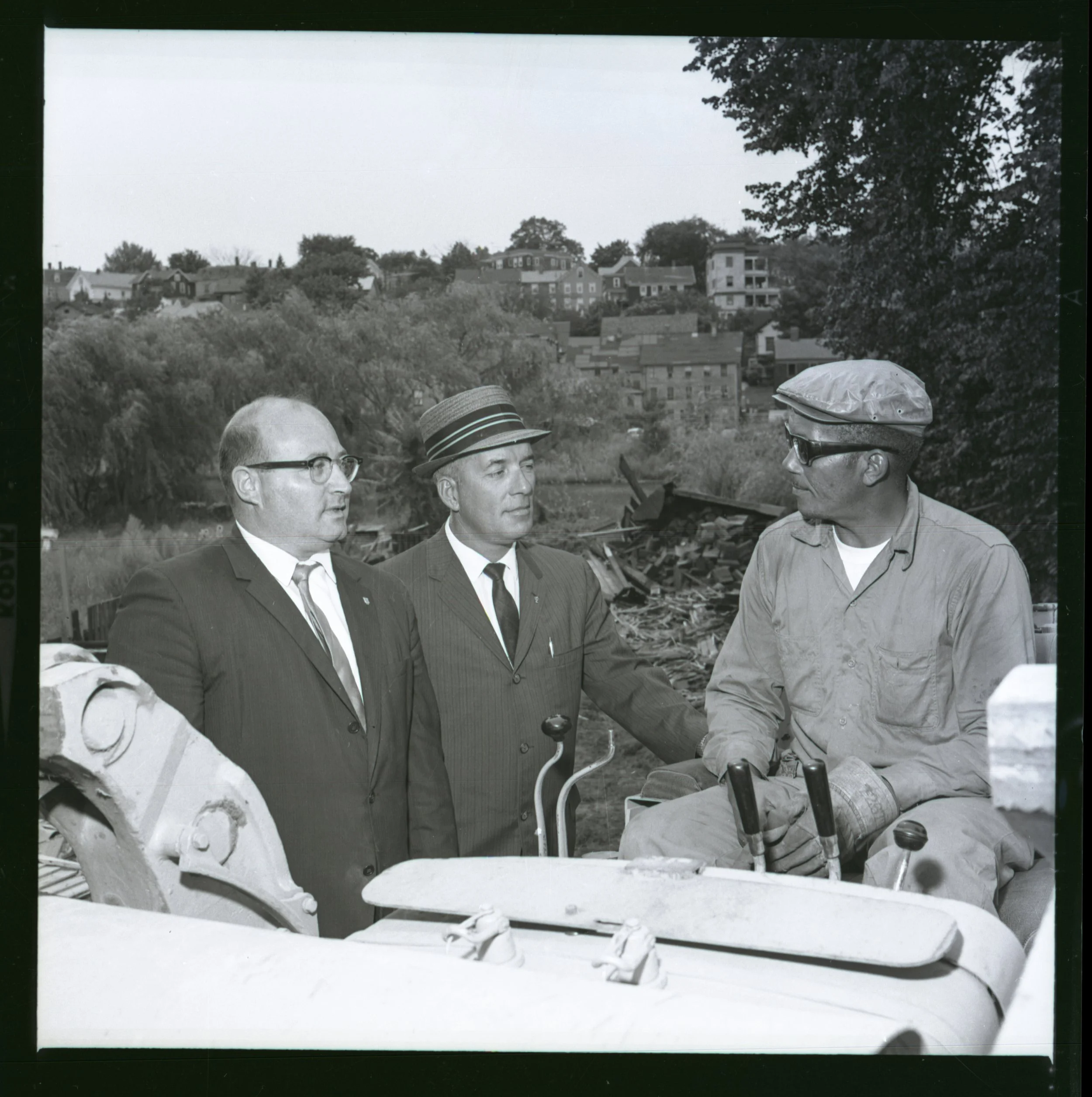 With a pile of debris left from the demolition of 100 Winthrop Street in the background, F. Jerome Silverstein of redevelopment, and Mayor Richard Martin, chat with the unidentified bulldozer operator.