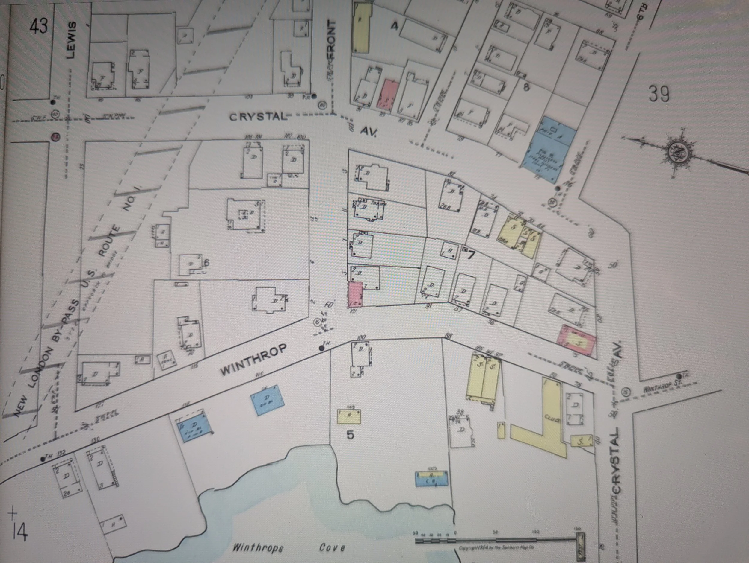 This is a section of the Sanborn Fire Insurance map from 1954. Crystal Avenue has retained its original dog leg to the north coming east off of Main Street on the other side of Winthrop Cove. As a frame, or wooden structure, dating from the 1840s, the Misarski home at 100 Winthrop Street is drawn white with a D for dwelling. To the left at 110 Winthrop Street with a D in blue, representing cinder block construction, is the Potter home. Both the Misarski and Potter families are first-time homeowners.