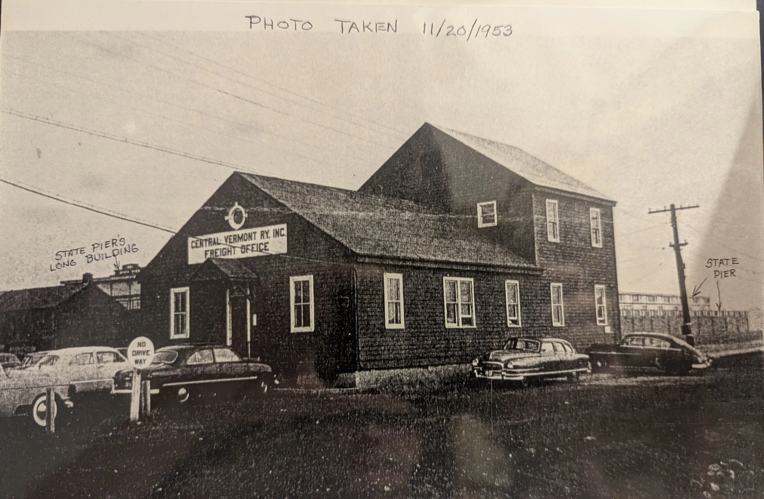 Long-standing building that housed the freight and superintendant‘s offices pictured here in 1953. Behind is Warehouse #1 of the State Pier. Around 1970 the offices were moved to a remodeled space in the roundhouse located near the north end of the yard.