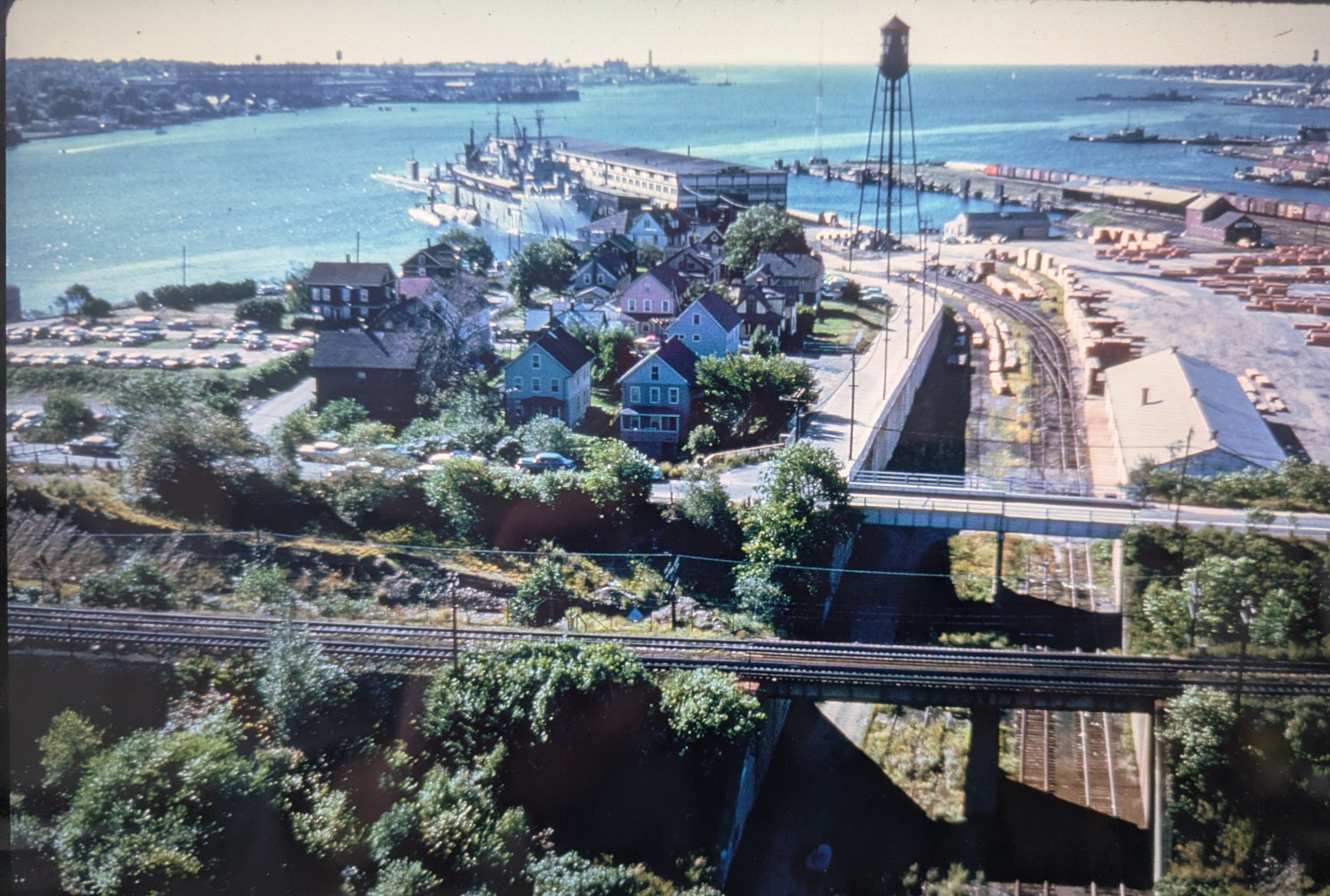 Views from the bridge. Looking south, downriver. Foreground to background: the New Haven shoreline route, State Pier road. CV tracks leading into Warehouse #1. Sub tender Fulton, AR11, with subs, State Pier water tower, CV freight office, CV pier, Electric Boat and Pfizer on the left. Perhaps my favorite view… definitely the most interesting. Credit to George Oldershaw, 1961