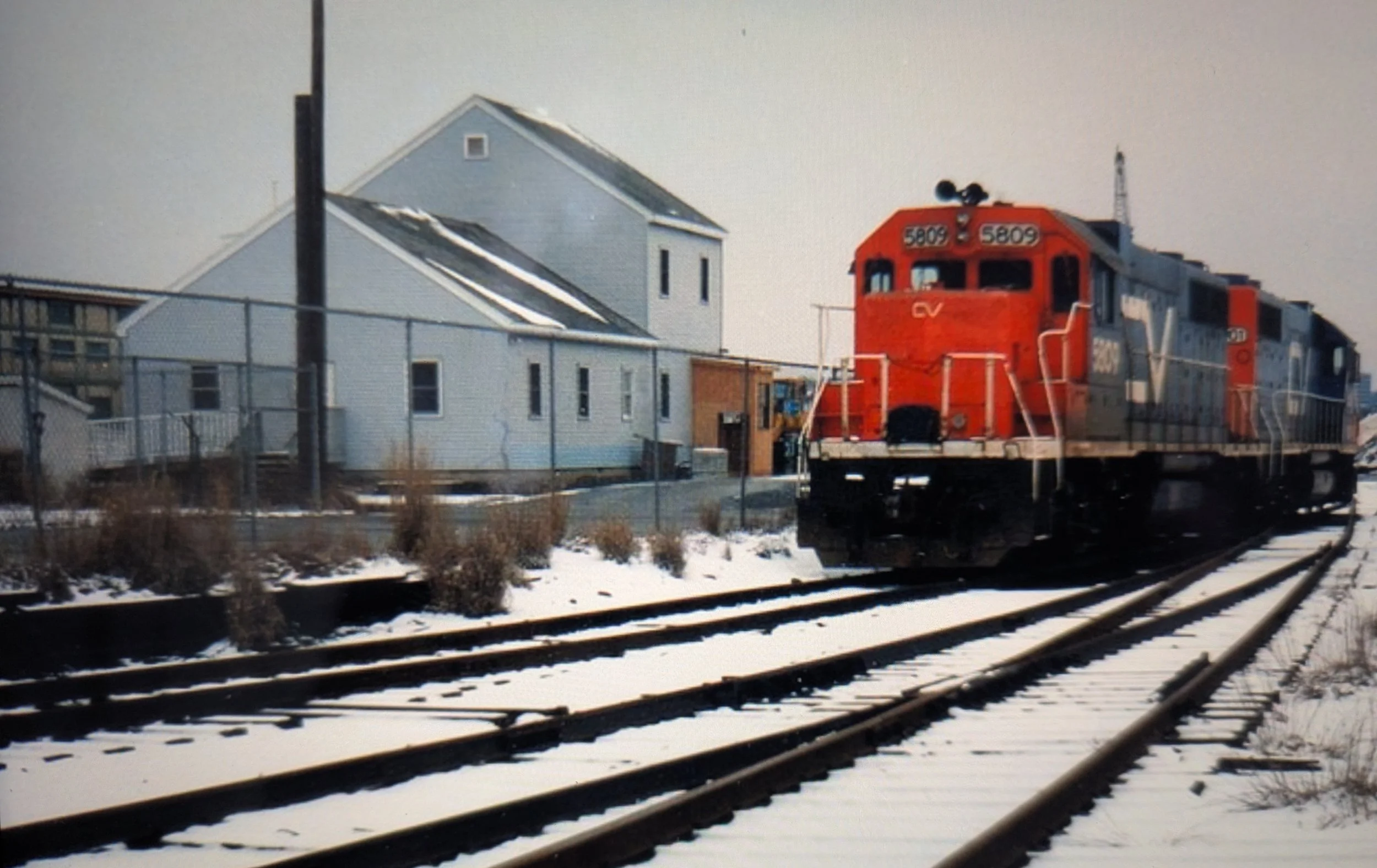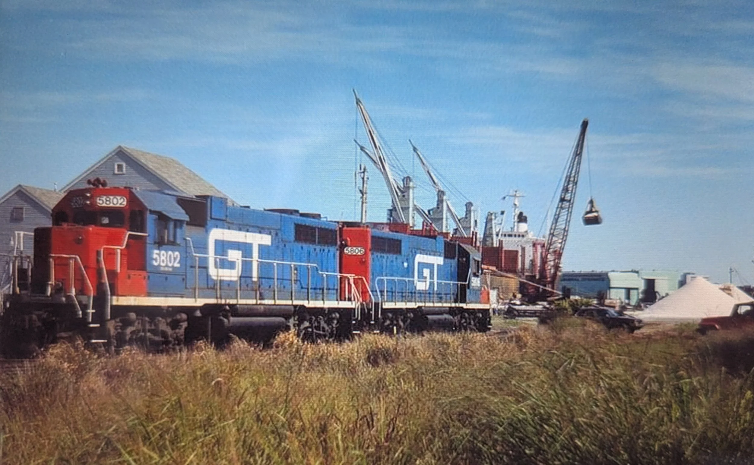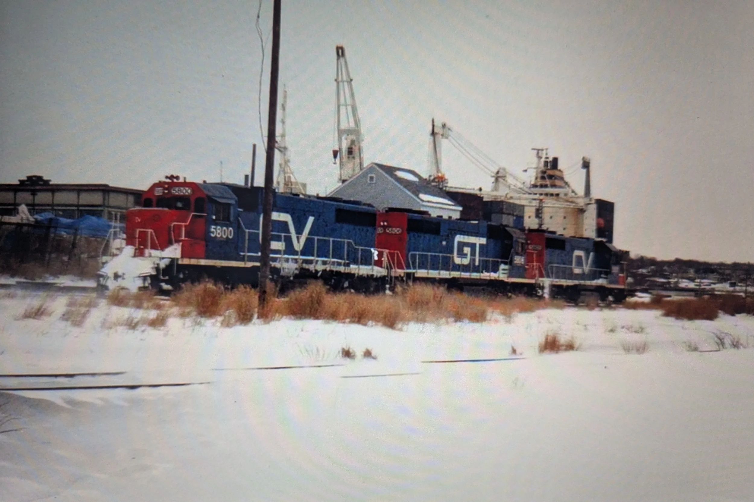 Two Grand Trunk Western await their next assignment by the former freight house while road salt is being unloaded from a ship tied up at the State Pier. GTW, like the CV, is part of the Canadian National family of railroads and their motive power often mingles. The Green Monster of Electric Boat can be seen below the clam shell. Courtesy of Mark Beebe, 8/26/93
