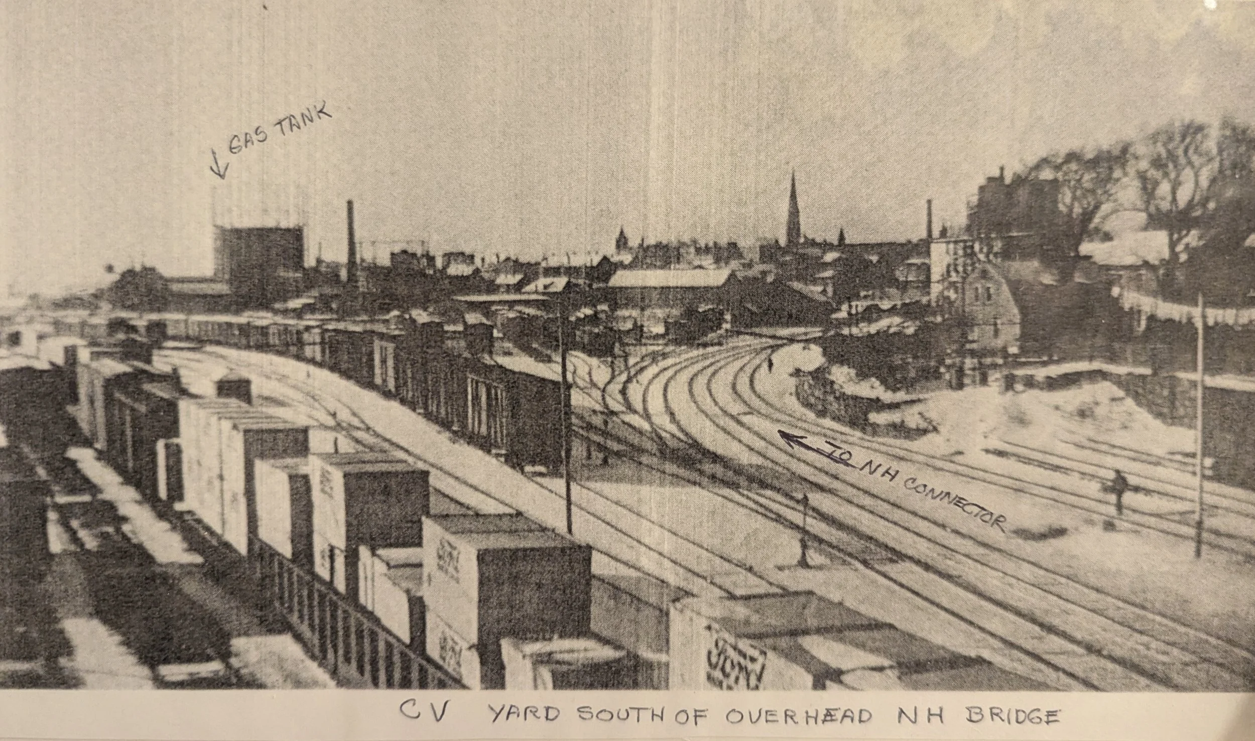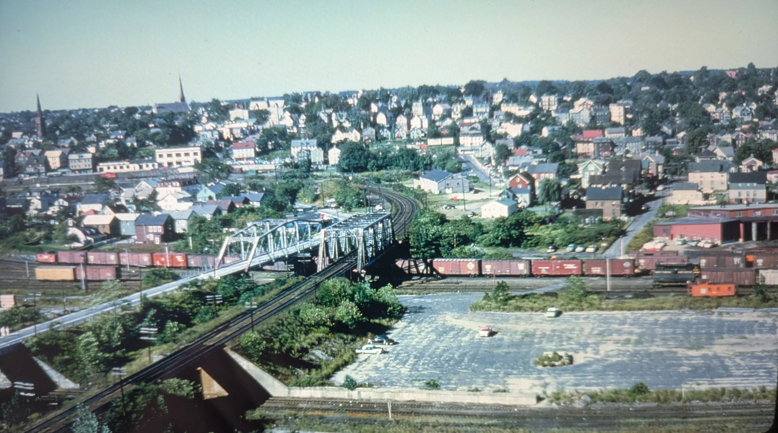 Now turning to the southwest. A string of interchange boxcars with a New Haven caboose waiting to be pulled and shoved in place by #8162 sitting by the roundhouse. Steam is gone and in 5 short years so will nearly everything else, minus the church spires.