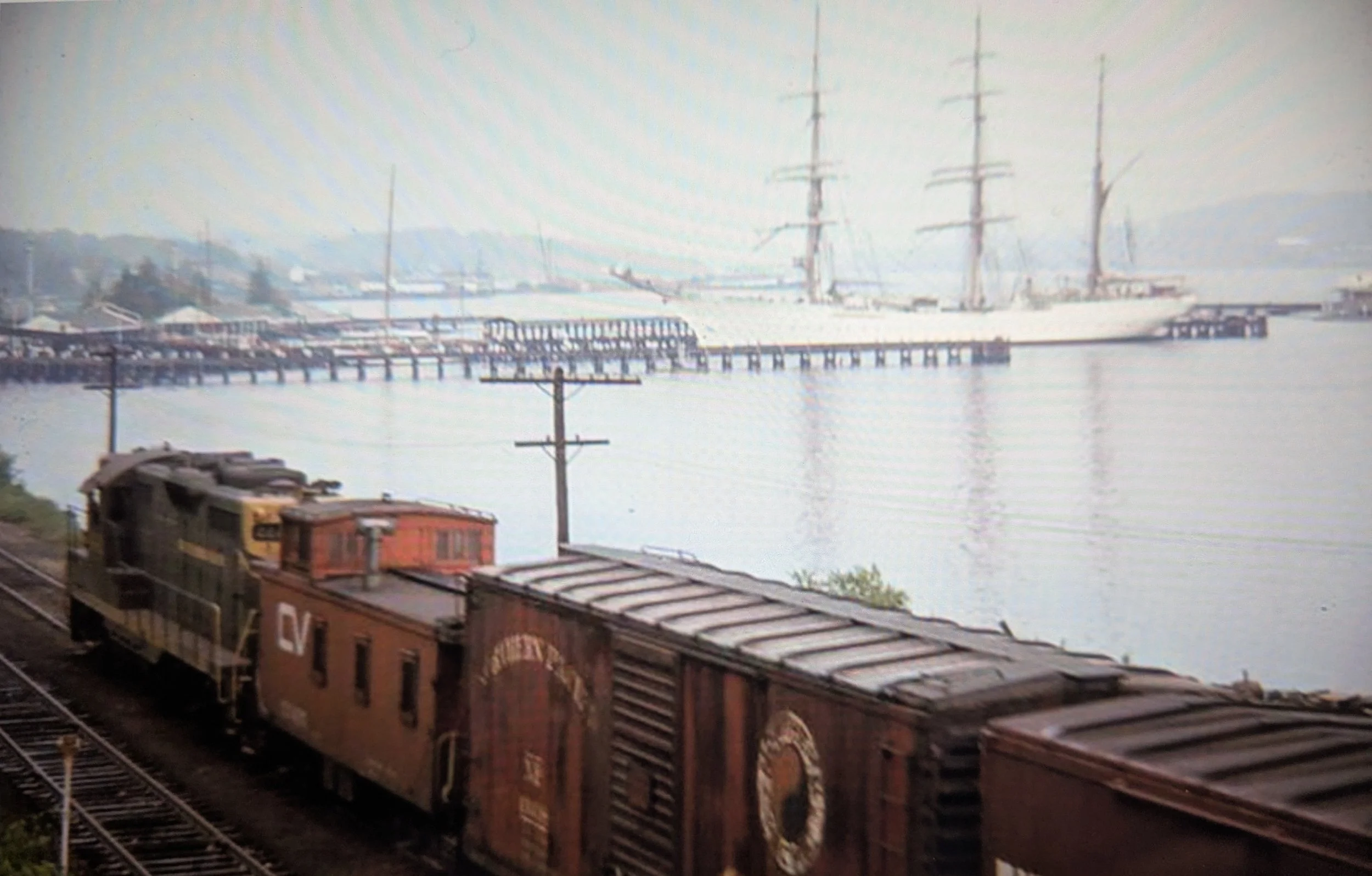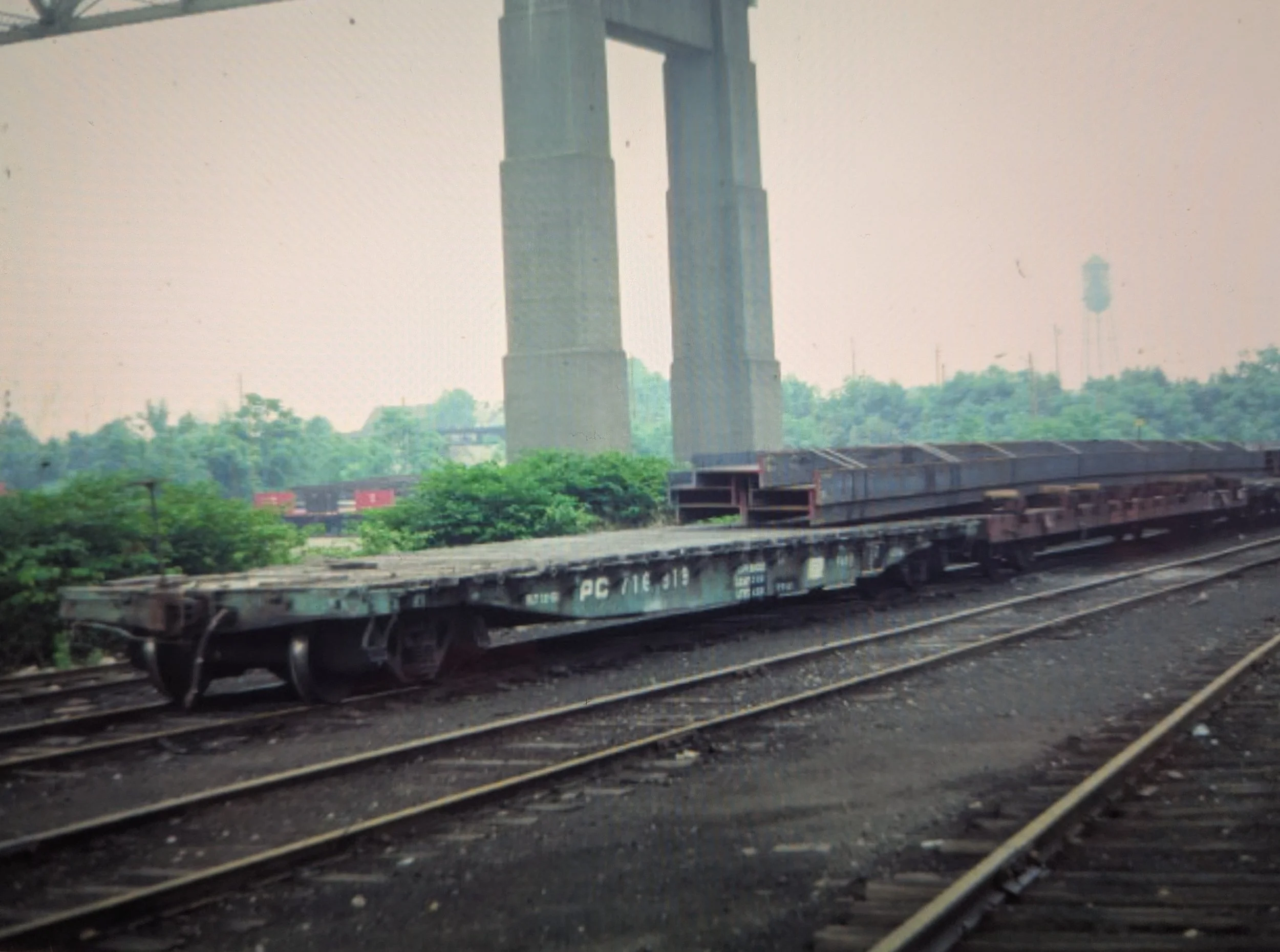 A Penn Central flat helps with the overhang from 5 oversized I-beams. Note the State Pier water tower.