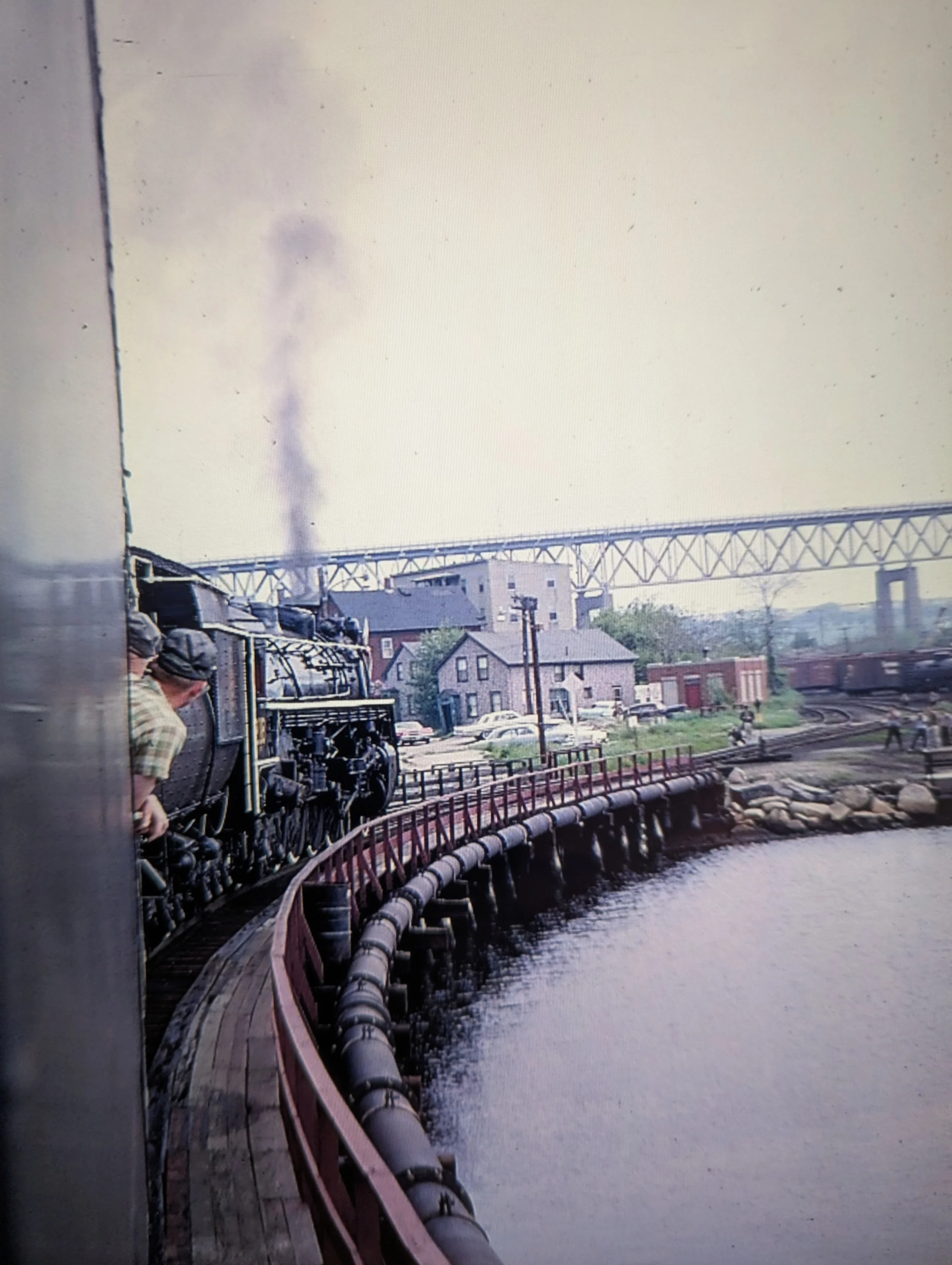 Walking along the south side of the bridge toward New London. #8162 is in the left foreground. Note the outside braced wooden boxcars on adjoining tracks, the 4 empty stalls of the roundhouse, the empty turntable - there is no reason to turn a diesel. Note also the employee parking lot abutting 4th Street. Harrison Street runs left and right a couple of houses above. Credit again to George Oldershaw, 1961
