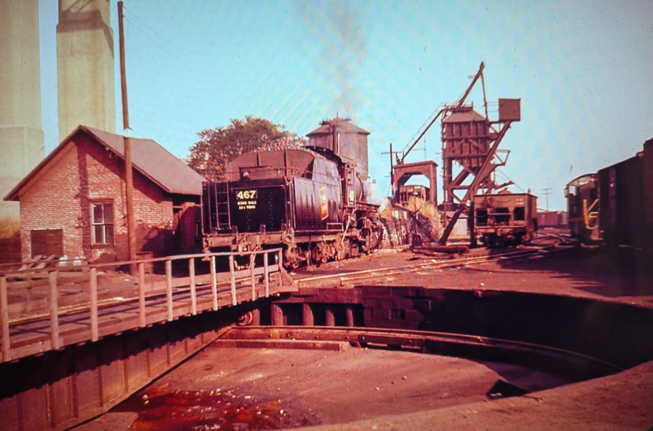 October 14, 1956. #467 is backing onto the turntable. On the left is the tool house. That odd-looking outside braced structure is the coaling tower. In the shed attachment on the left we can see a hopper of coal being unloaded, the coal going into the tower for a chute delivery into the tender. On the right, partially hidden, is a diesel switcher, possibly #8137, that would soon take over #467‘s duties.