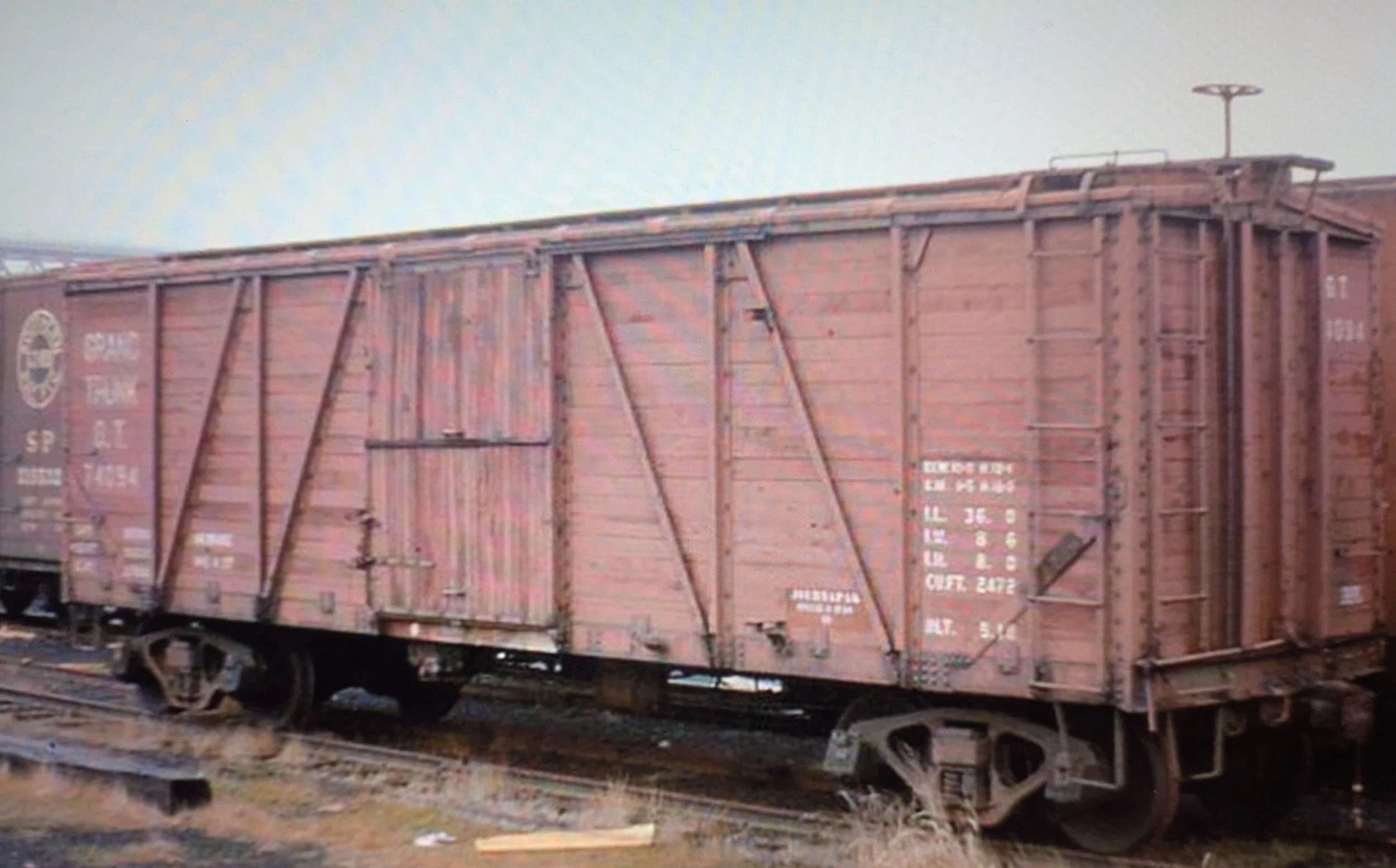 Let me deviate for a moment away from sailing vessels and locomotives to rolling stock. In this 1968 photo from Ron DeFilippo, we‘re looking at a Grand Trunk boxcar built in May of 1918. Notice the side ladders, the roof walk and the brake wheel to the right. Despite the hazards of snow and ice, brakemen were often required to stand atop cars in motion while setting the hand brake. As mentioned on the Hallam Street page, boys and girls from East New London would copy the brakemen in climbing atop the cars, still or moving, and ride them sometimes across the river to Groton. The increased sway of empty boxcars at speeds between 5 and 8 m.p.h. over jointed rail gave these young riders the illusion and thrill of surfing.