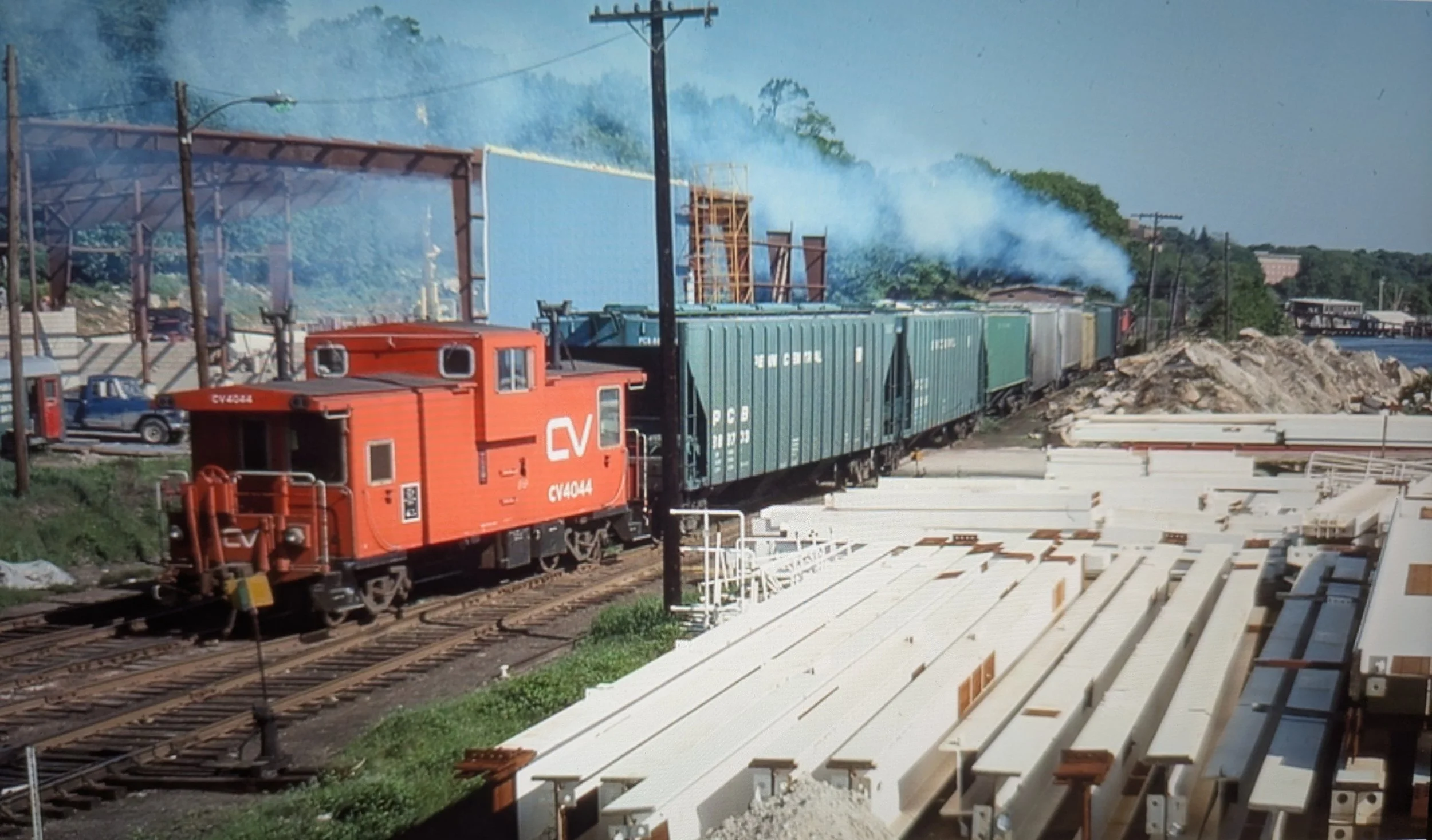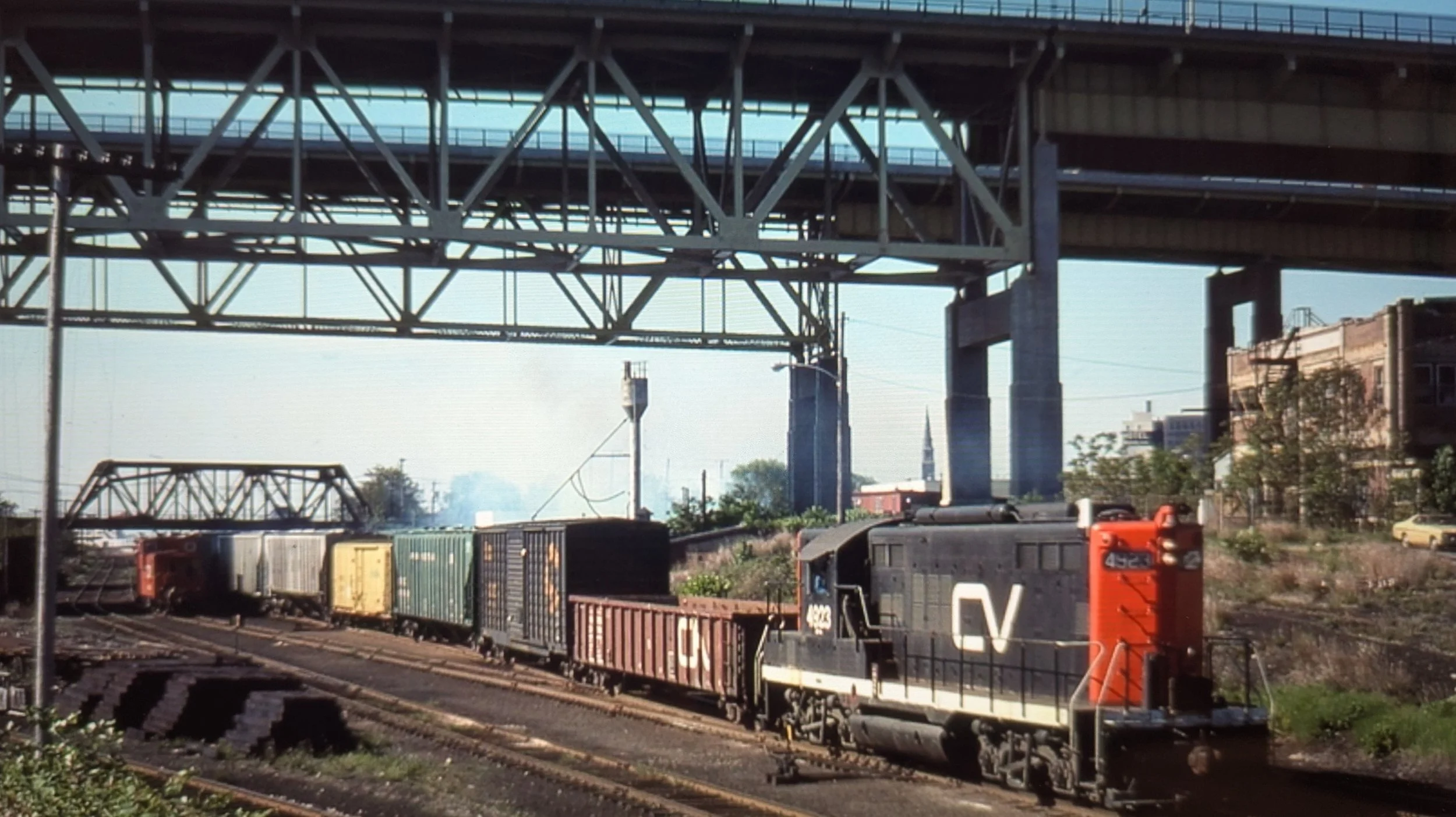 Van #4044 takes up the rear as #4923 builds up speed. Most cars are headed for K&L Feeds in Franklin just south of Murphy road. F &F Distributors is erecting a rail-served warehouse on the left. The steel I beams on the right belong to Thames Valley Steel. Credit Ken Patton