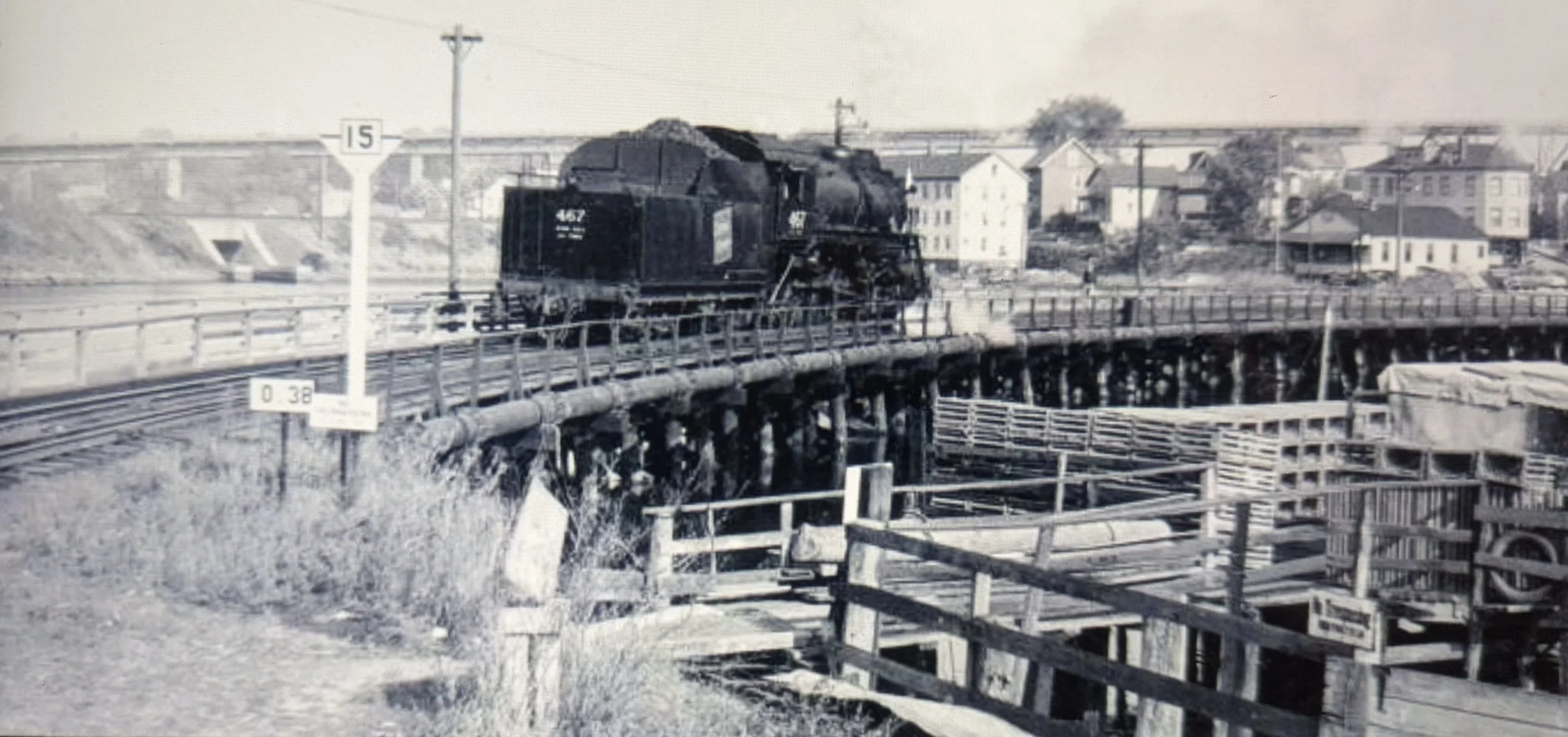 The date is still April 15, 1957. We‘re in the last months of steam on the Central Vermont. #467 has just left a string of cars for the New Haven on the interchange track along Water Street. Look closely and you can see steam and the top of the coal pile behind the cab on the tender. Besides coal, the tender also carries water to make the steam that creates pressure to drive the pistons which are connected with the rods that move the driving wheels that go round and round.