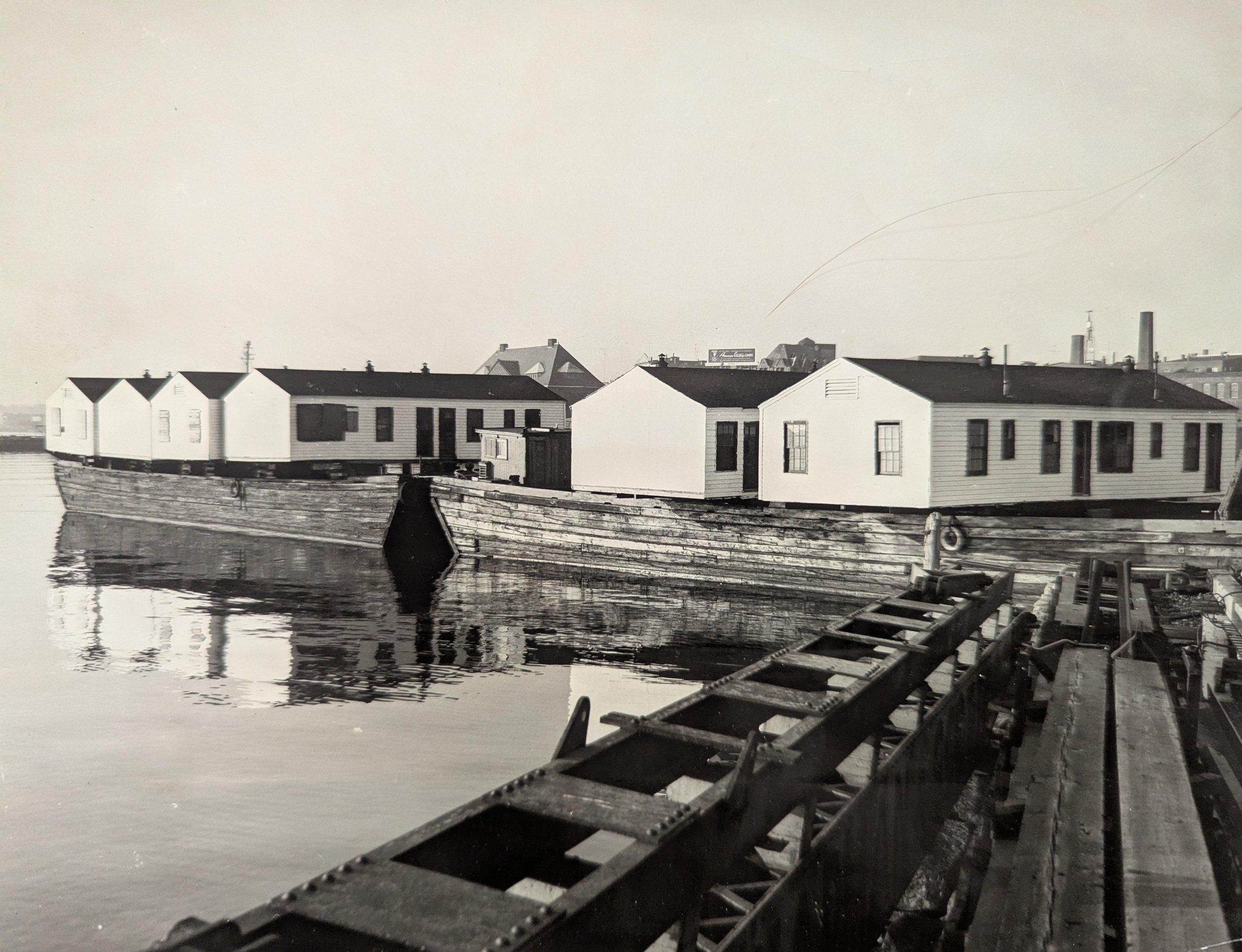 In 1950, a chicken farmer in Colchester ordered outbuildings to house the workers. The buildings arrived by two barges that were left tied up at the end of the CV pier, left of the 47 shown on the map. State Pier is on the right. A Day photographer took this picture while the farmer quickly made arrangements in seeking approval to finish the move by land.