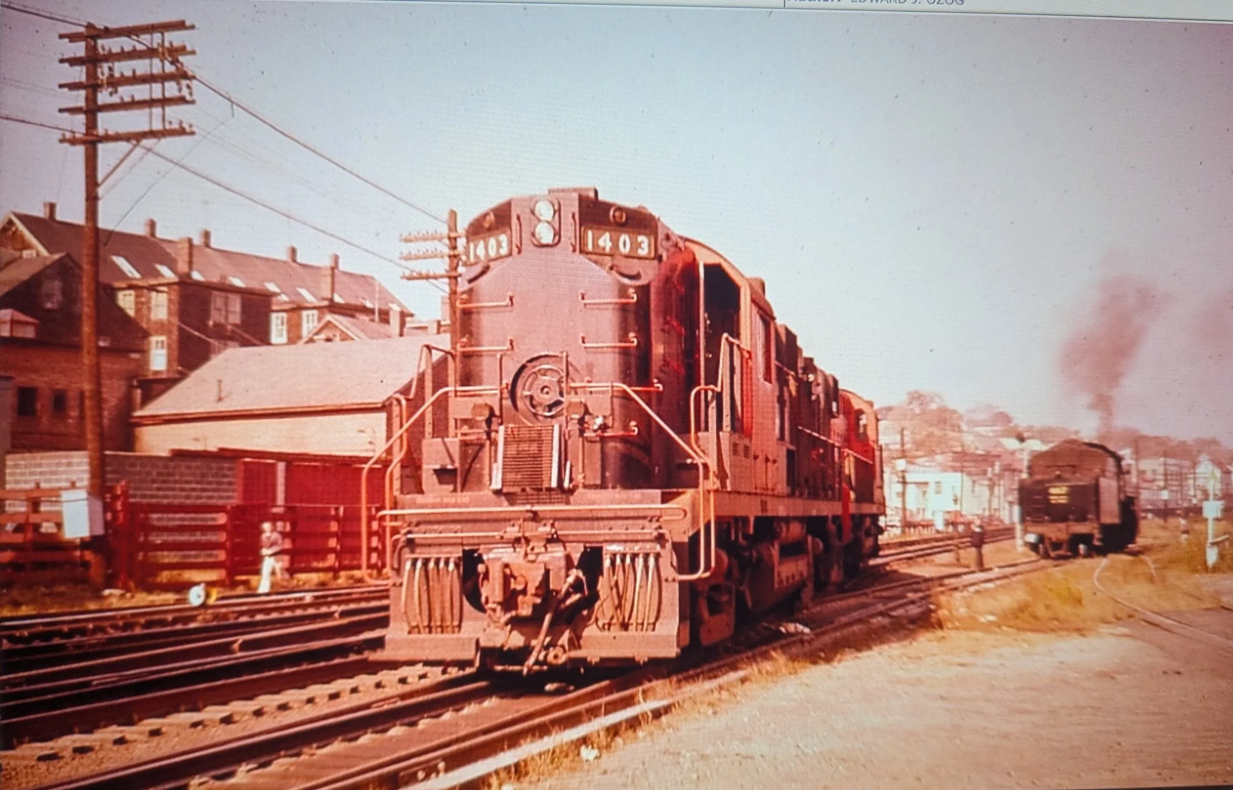 The date is April 15, 1957. Two railroads are meeting to exchange cars, the New Haven in the foreground, the Central Vermont in the background. We‘re in the last months of steam. on the CV as evidenced by #467, a 2-8-0 (2 pilot wheels, 8 driving wheels, no trailing (training ha!) wheels). The NH ran it‘s last steamer 4 years earlier. We are looking at an Alco RS11 in McGinnis orange and black livery.