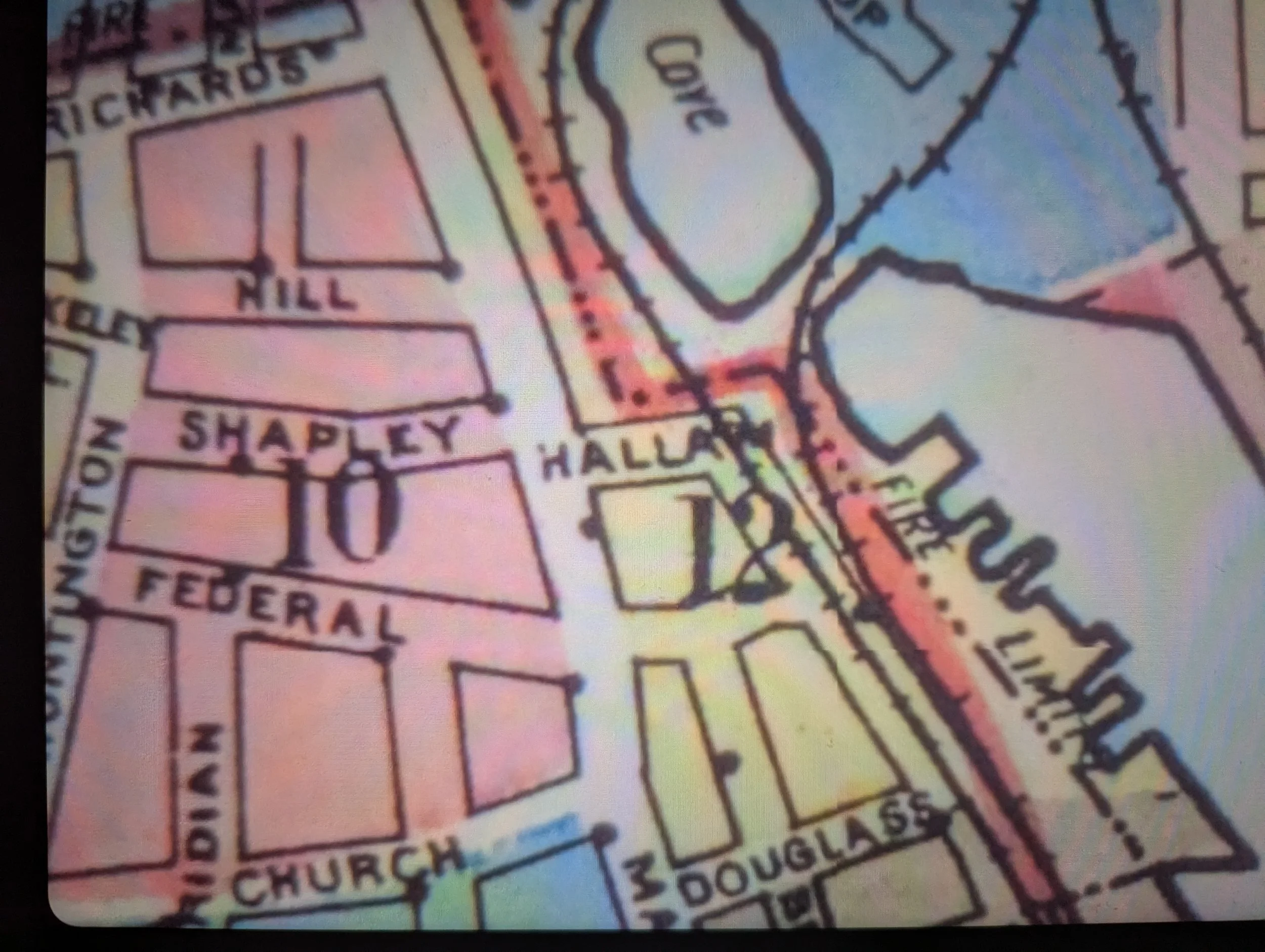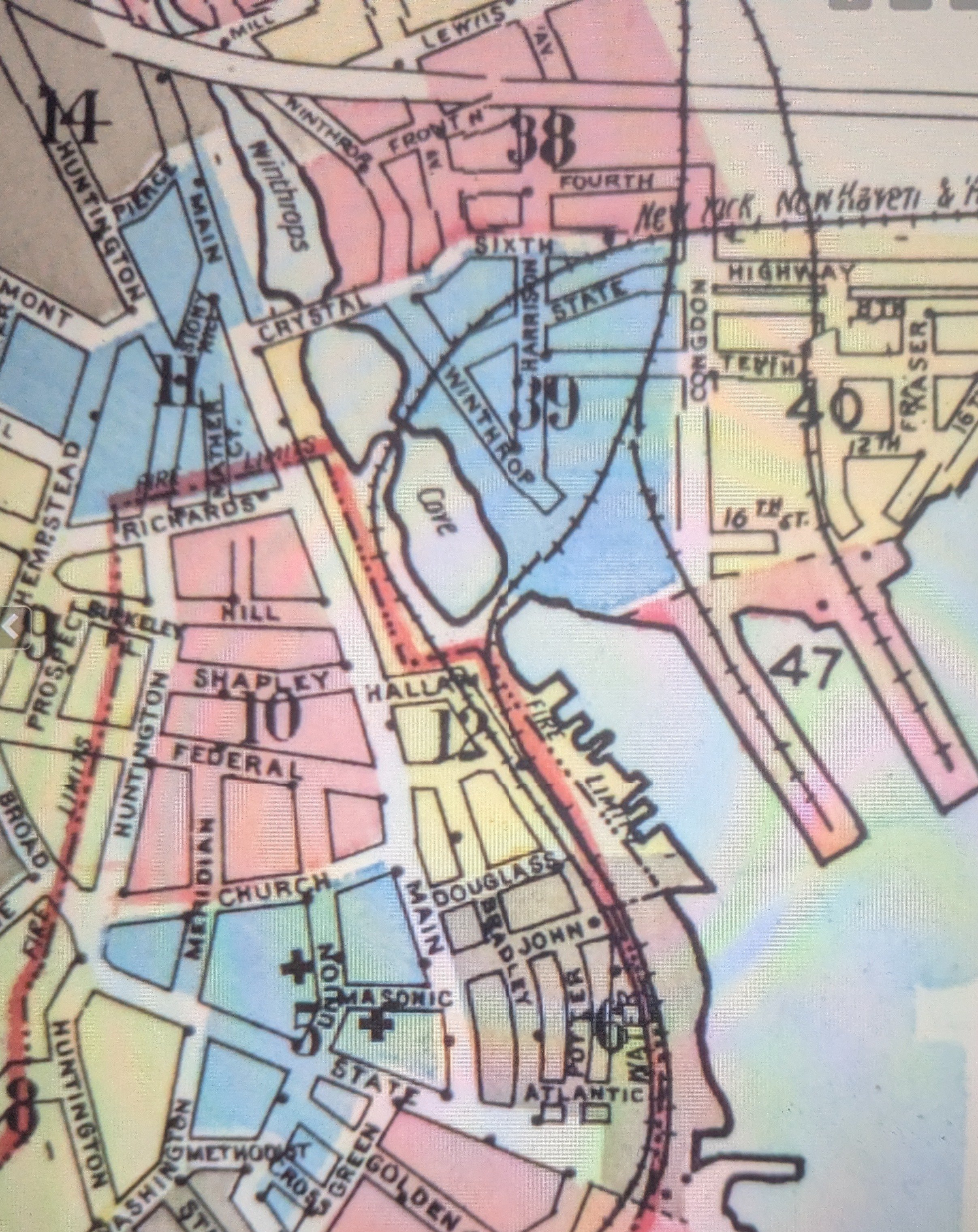 We‘ll start out with the known, the 1954 Sanborn map view of the Hallam Street area where the two railroads shook hands down by the Ferry Landing on lower Winthrop Cove at the bottom of Hallam Street.