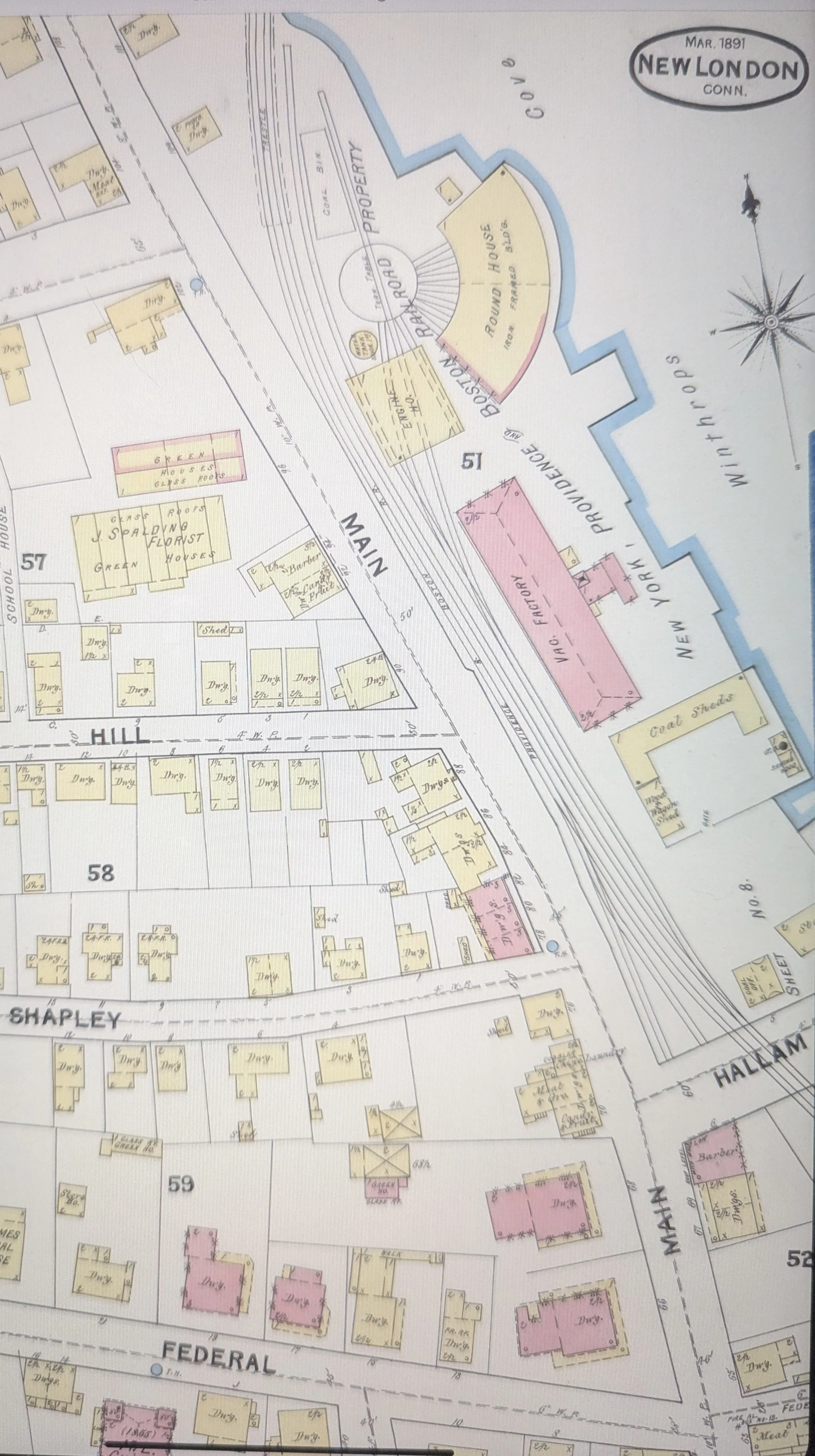 Fast forward a hundred years or so to 1876. Main Street runs north and south in the upper left-hand corner. The Albertson and Douglass Machine Company with its central stair tower is marked with a 29. New London Woolen Mills with smoke rising from its tapered smokestack is at 34., and it’s neighbor to the right, at the bottom of Hallam Street, is Chappell Wood & Coal marked with a 46.