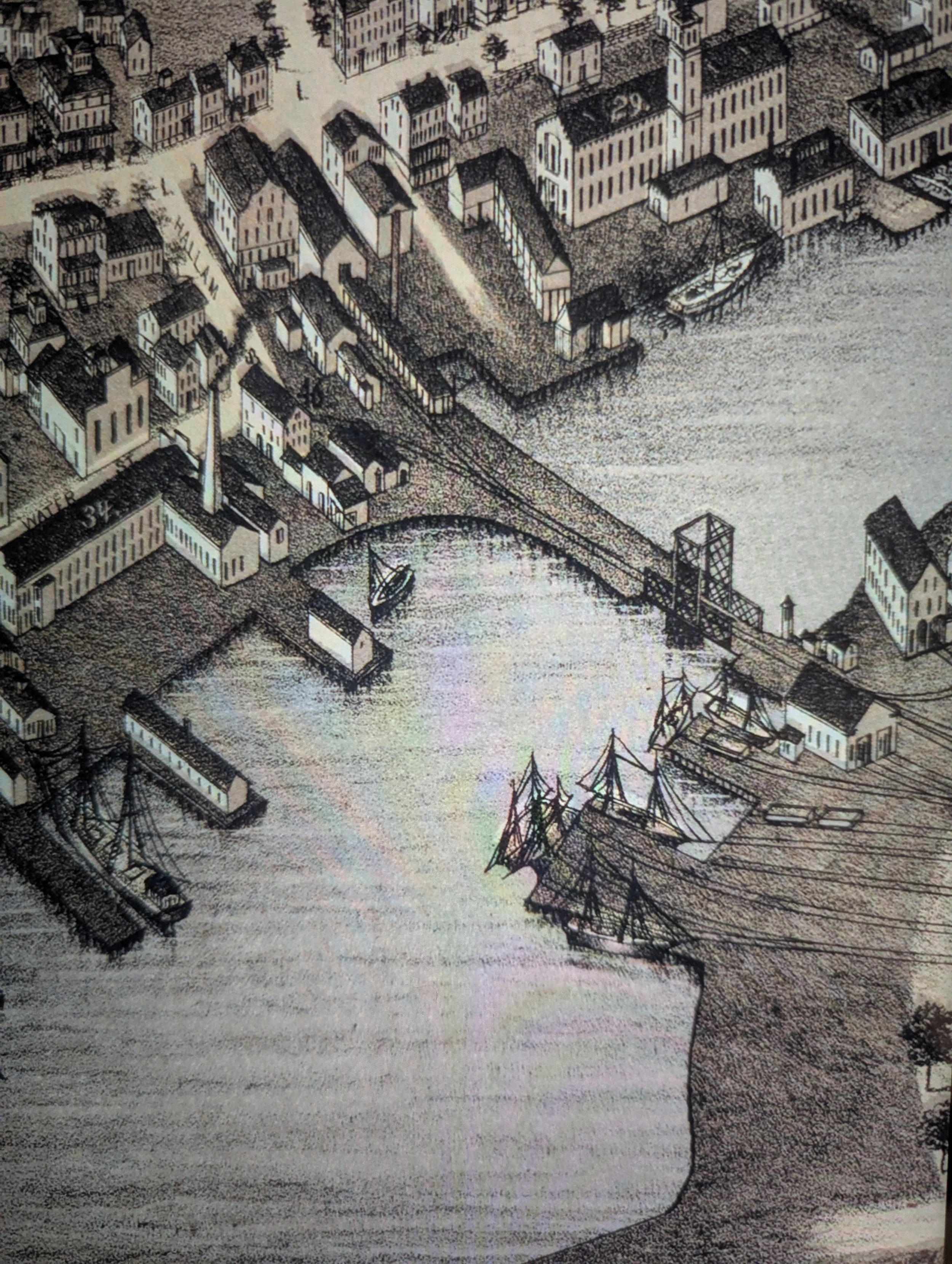 The New London Northern Railroad swing bridge links Winthrop Neck with the rest of the city and the Shore Line Railroad which runs to New Haven and points west. Water freight and passenger traffic are still important, but the owners of these sailing vessels are already finding their revenues plummeting as the railroads and the use of steam engines continues to expand.