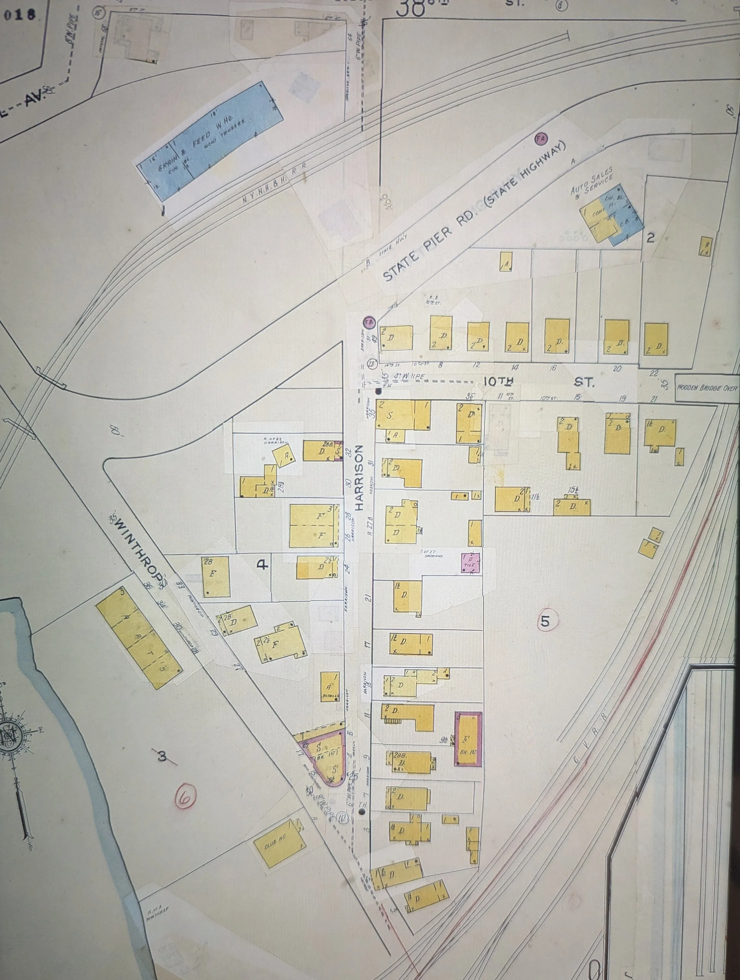 The large rectangular outline on the cove side of lower Winthrop Street was a frame apartment house, 3-story, four sections, 12 apartments in all. Up until redevelopment, the apartments were largely occupied. The street numbers are 36, 34, 30, and 28 Winthrop Street.