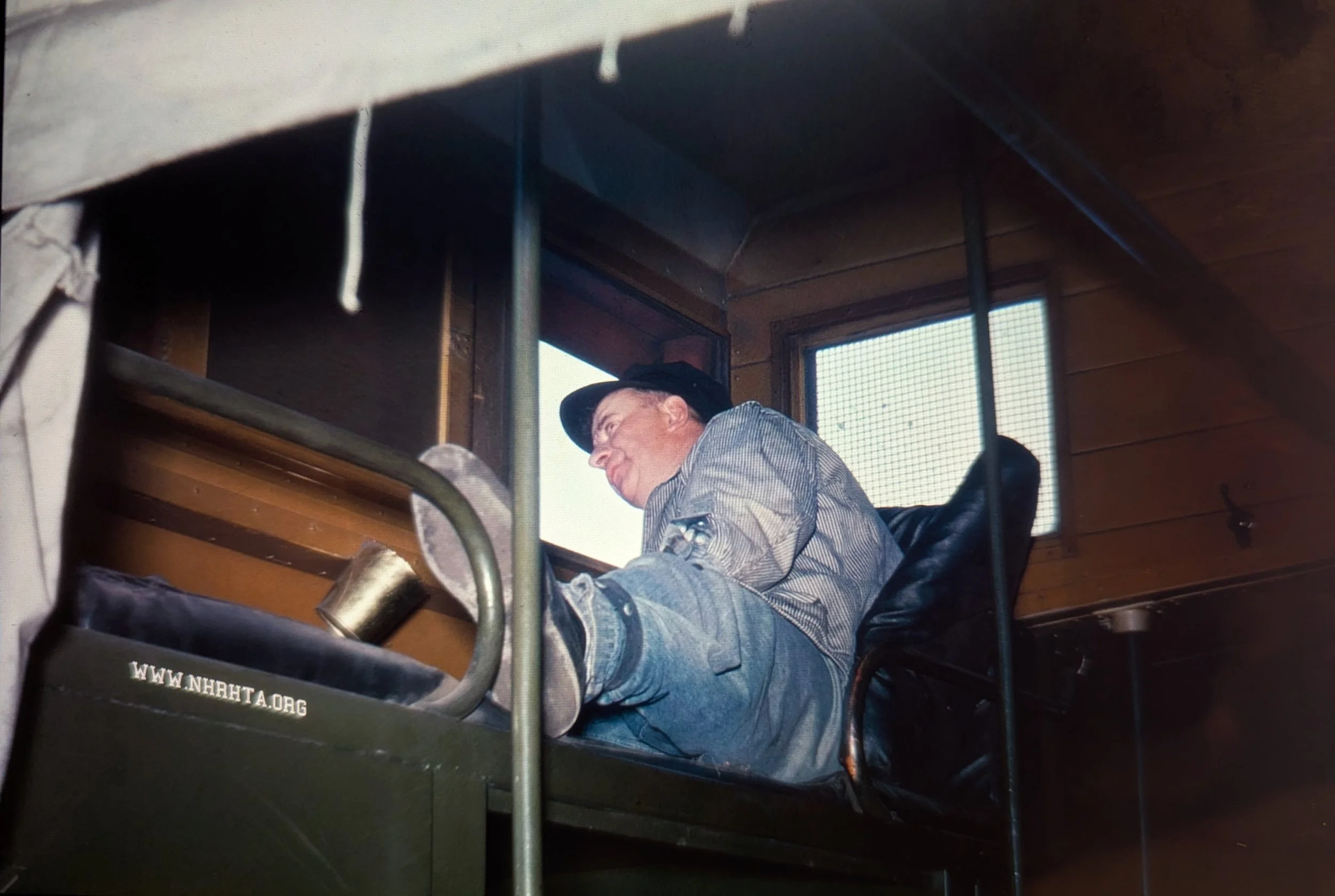 Inside the cupola of a caboose. Notice the rubberized cloth band near the bottom of the brakeman‘s jeans. These bands kept loose jeans in check and out of the way. Courtesy the New Haven Railroad Historical & Technical Assn.