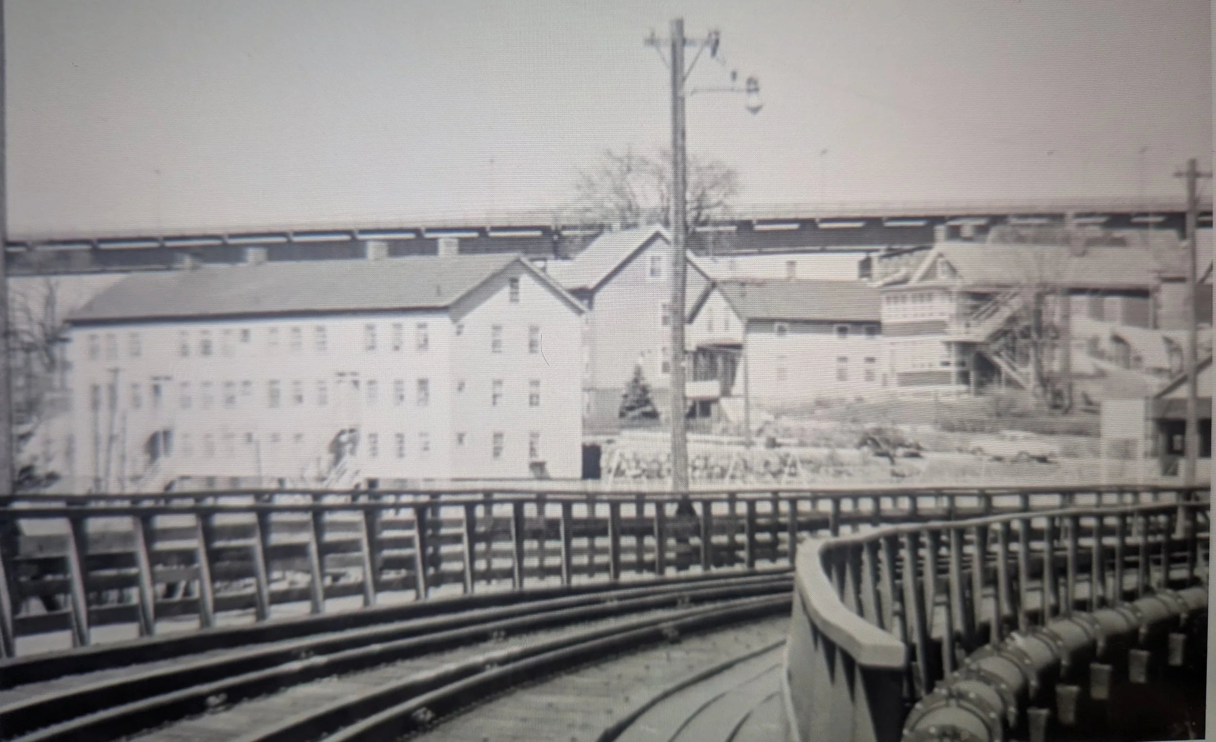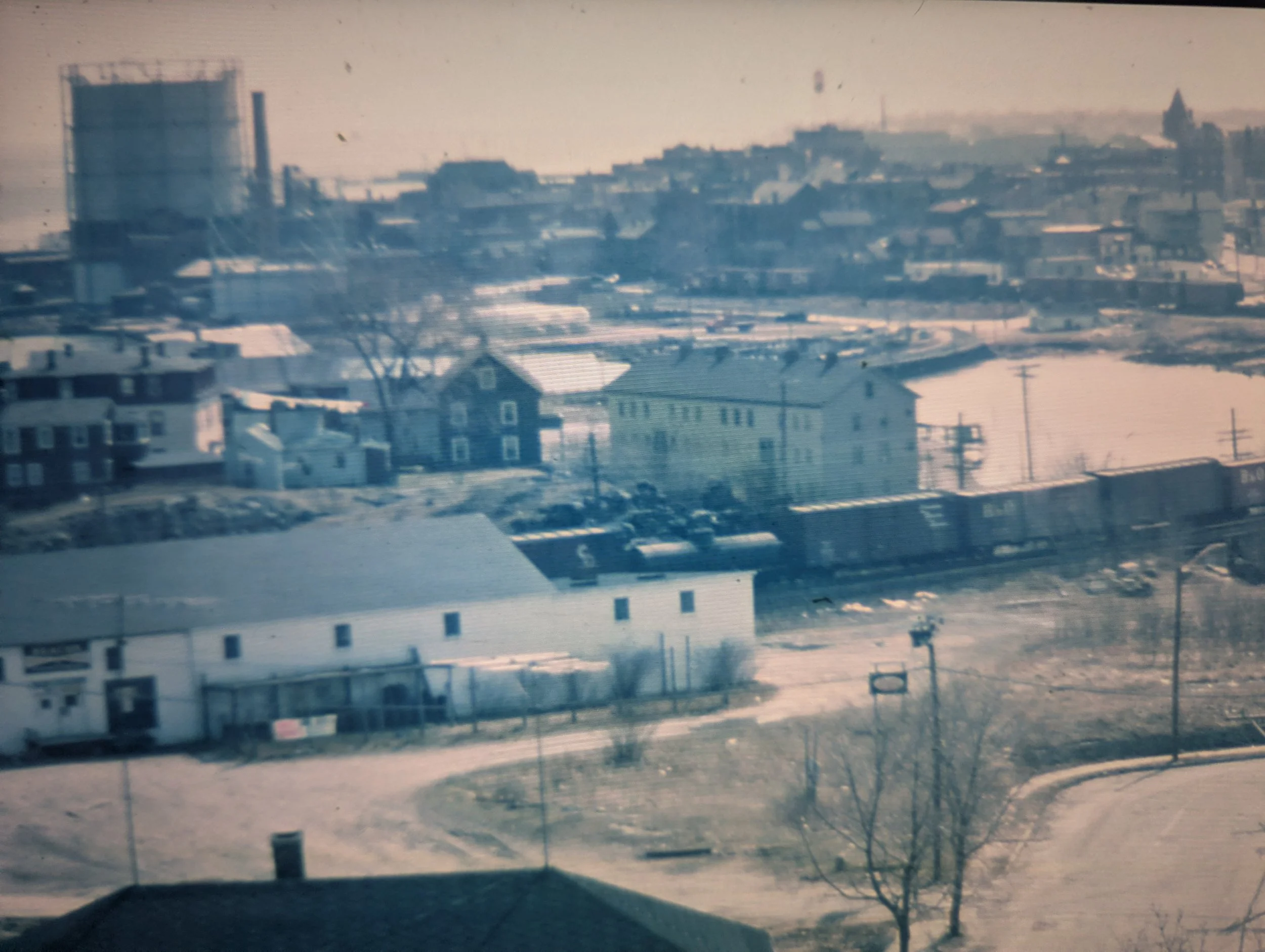 The same building group looking south from the bridge, courtesy George Oldershaw, 1961. The Crystal Avenue bend is in the lower right. The long white single story building is the New London Grain Co., both rail and truck served. Long freights snaking through town were the rule until the Penn Central started rerouting through freight traffic over the old Boston & Albany line. Above the left-most chimney of 28-36 Winthrop, you can just make out the New Haven caboose at the end.